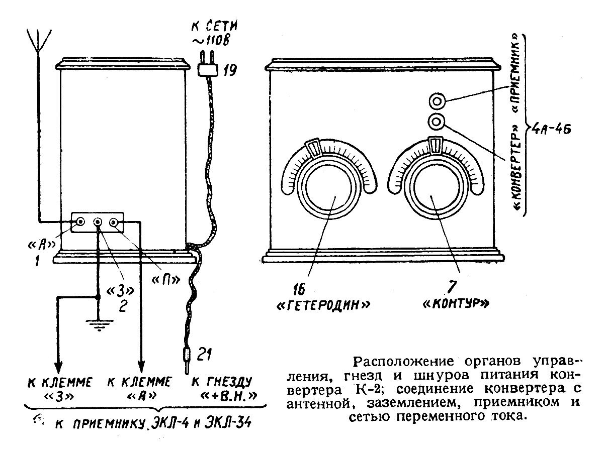 Рис. 1. Расположение органов управления, гнезд шнуров питания конвертера К-2; соединение конвертера с антенной, заземлением, приемником и сетью переменного тока.