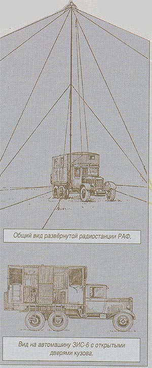 Одним из важных и необходимых изделий явилась радиостанция "РАФ" образца 1940 года, радиозавода N 197, имеющая передатчик мощностью 500 Вт. Радиостанция "РАФ" монтировалась на шасси трехосного автомобиля повышенной проходимости "ЗИС-6", в деревянном кузове с утеплёнными стенками; предназначалась для обеспечения двухсторонней связи с различными наземными и самолётными радиостанциями; позволяла вести связь телефоном, ручным телеграфом и автоматической аппаратурой приёма и передачи. Общий вес аппаратуры составлял 2500 кг.