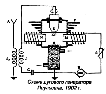 Исследования по радиотелефонии во многих странах показали, что для успешной передачи текстов необходимы незатухающие колебания, тогда как искровые передатчики давали только затухающие колебания. Для получения незатухающих колебаний сначала использовали электрическую дугу Петрова, к слову, на западе ее именуют, дугой Дэви. В 1900 г. английский инженер электрик Вальдемар Дуддель (W. Duddel) указал метод получения устойчивых и мощных высокочастотных колебаний с помощью дуги. С этой целью в схему дугового генератора он включил колебательный контур, настроенный на высокую частоту. По прошествии 2 лет, другой Вальдемар, но уже датский инженер Вальдемар Паульсен (V. Poulsen), известный тем, что первым изобрел магнитофон, построил практическую конструкцию радиотелеграфного дугового генератора незатухающих колебаний. Новый путь получения незатухающих колебаний заявил о себе только во время первой мировой войны, когда радиостанции стран Антанты мгновенно перестали ловить сигналы передатчиков немецкого флота. Оказалось, что задолго до начала войны немецкие специалисты учли недостатки искровых передатчиков и перешли на передатчики с использованием электрической дуги. Таинственное исчезновение немецких сигналов объяснялось тем, что при передаче незатухающих колебаний телеграфные знаки не прослушиваются телефоном. Из-за этого в телефонах шел неразборчивый треск. Дуговые передатчики хорошо себя зарекомендовали на мощных телеграфных станциях того времени. Они обеспечивали телеграфную связь на расстоянии в несколько тысяч километров. В 1920 г. была установлена рекордная связь между Гельтоавым (Англия) и Малабаром (остров Ява, Индонезия) на расстоянии 12000 км. Регулярные радиотелеграфные передачи велись на значительно меньшие расстояния. Лучшие дуговые генераторы стабильно работали на волнах не короче 1000 метров (примерно середина нынешнего широковещательного диапазона длинных волн).