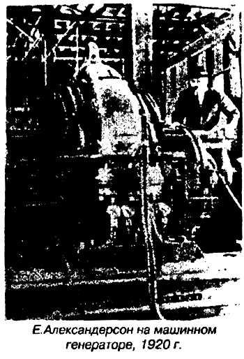 Замена электрической искры дугой также не ликвидировала все упомянутые недостатки использовавшихся в то время генераторов. Радиотехника все больше склонялась к использованию машинных генераторов высокой частоты для непосредственного питания антенных цепей радиостанций. Хотя эти генераторы и имели недостатки другого рода, низкая частота генерирования тока и получение соответственно этому длинных радиоволн, но они позволяли в какой-то мере решить на время проблему радиосвязи, хотя и не полностью. Первым приблизился к решению этой проблемы профессор Питсбурского университета и консультант Метеорологического бюро Реджинальд Обри Фессенден (Fessenden Reginald Aubrey). И, не удивительно, он еще в 1895 г. пришел к мысли о замене затухающих электрических колебаний незатухающими, способными передать речь, если их промодулировать звуковыми частотами. В 1900 г. он пытался передать речь с помощью искрового передатчика, но безуспешно. В 1906 г. для этой цели он решил использовать генераторы высокой частоты. На протяжении нескольких лет был сконструирован ряд генераторов с частотой тока от 60 кГц до 200 кГц. Р. Фессендена называют одним из отцов радиовещания, до него все радиопередачи шли в режиме телеграфа, с использованием азбуки Морзе. 4 января 1906 г. Р. Фессенден провел первую радиопередачу в эфир из американского городка Брант Рок штата Массачусетс. В передаче прозвучали музыкальное произведение Генделя “Ларго” и многочисленные рекламные объявления. Слушатели принимали передачу на детекторные приемники. За эту радиопередачу только один “отец” Р. Фессенден попал в известную книгу рекордов “Гинесса”, про других же почему-то забыли. Дело в том, что когда Р. Фессенден задумал передать речь по радиоволнам ему понадобился машинный высокочастотный генератор с небывалой для того времени скоростью вращения 100000 об/с и он обратился к известнейшему электротехнику того времени Чарлзу Протеусу Штейнмецу работавшему в фирме General Electric Company. К слову, позже, он стал большим другом Советской России и даже вождь мирового пролетариата В.И.Ленин посчитал за честь послать ему свое фото с надписью. Ч. Штейнмец поручил сконструировать такой генератор своему сотруднику, 26–летнему молодому выходцу из Швеции Эрнсту Александерсону (Ernst Frederic Werner Alexanderson (25.01.1878-14.05.1975)). Э. Александерсон не только разрабатывал машинный передатчик, но производил его монтаж и находился на передающей станции во время исторического радиовещания. В последствии Э. Александерсон стал выдающимся ученым радиотехником. Он проработал 46 лет в General Electric Company, со временем стал ее главой, в этой компании получил 322 патента и еще принял участие в создании Radio Corporation of America. За консультациями по машинным передатчикам к нему приезжал из Европы не менее знаменитый, Гульемо Маркони. С помощью машинного генератора его конструкции американский президент Вильсон передал через океан ультиматум Германии о окончании войны в 1918 г. В этом же году, отец магнитофона В. Паульсен не оставляет попыток передать речь по радиоволнам с помощью дугового передатчика и проводит эксперименты в этом направлении. Проанализировав полученные результаты, он отдал в дальнейшем предпочтение другим типам генераторов.