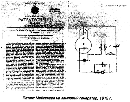 И, все же, несмотря, на впечатляющие успехи дуговых и машинных передатчиков, они были вынуждены уступить свое место в радиосвязи ламповым передатчикам. Ламповые передатчики практически могли работать в любом диапазоне частот. Потребовалось 7 лет после изобретения немцем Робертом фон Либеном (Robert von Lieben) и американцем Ли де Форестом лампового триода прежде, чем появился первый ламповый передатчик. Создателем первого лампового передатчика стал 30 летний сотрудник немецкой фирмы “Telefunken” Александр Мейсснер (A. Meissner), который 10 апреля 1913 года подал в Германское патентное ведомство заявку на изобретение. Схема передатчика базировалась на несовершенной ионной лампе триод своего соотечественника фон Либена. В этой схеме, частота генерируемых колебаний могла быть выше или ниже резонансной частоты колебательного, в зависимости от величины связи между катушками (на рисунке патента детали 6,9 и 10). При слабой связи частота колебаний ниже резонансной частоты контура, а при сильной – выше. Через 2 месяца была готова рабочая конструкция передатчика и уже 21 июня состоялась первая радиотелеграфная связь на расстоянии 36 км, между Берлином и Науэном. Генератор работал на волне 10 метров. Эксперимент А. Мейсснера показал, что ламповый триод является лучшим устройством для возбуждения электромагнитных колебаний высокой частоты, в сравнении с другими на то время. Схема А. Мейсснера благодаря своей простоте получила широкое распространение и дальнейшее развитие. В 1915 г. появилась схема передатчика американского инженера из Western Electric Company Леона Хартлея (L. Hartley), больше известная как индуктивная трехточечная генераторная схема. В отличии от схемы А. Мейсснера, в ней использовано автотрансформаторное включение контура. Рабочая частота такого генератора обычно выше резонансной частоты контура. Через три года, другой инженер из этой компании, Эдвин Колпитц (E. Colpitts) предложил емкостную трехточечную схему. В основе схемы лежала емкостная связь между цепью анода и сетки и колебательный контур представляет при самогенерировании емкостное сопротивление. При таком построении схемы рабочая частота генератора лежит выше резонансной частоты контура. Эти три схемы передатчиков имеют применение до сего времени. К слову, схема передатчика Л. Хартлея была очень популярна в конструкциях передатчиков советских радиохулиганов работавших на средних волнах в 60-70-е годы. Для перехода от работы “морзянкой” к передаче речи, в первых ламповых передатчиках применяли амплитудную модуляцию. Обычный угольный микрофон включался в провод, идущий от генератора незатухающих колебаний к передающей антенне. От воздействия звуковых волн при разговоре изменялось сопротивление микрофона, а в такт с ним менялся ток в антенне.
