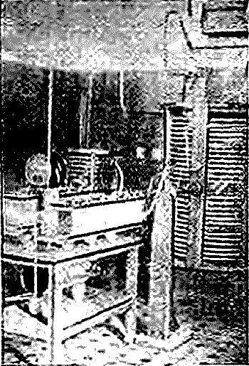 Стрелка антенного амперметра на 80 А всегда указывает наличие 100% мощности в антенне. За период соревнования отклонение мощности от номинала составляло не более 5%. А сейчас на протяжении всей стахановской декады с 10 по 20 февраля и в марте, ставшим стахановским месяцем, мощность совершенно не колеблется и строго равна 10 кВт. Сейчас станция работает на Т-образную антенну очень небольших размеров, но все же собственная волна антенны больше рабочей, и пришлось включить укорачивающий конденсатор небольшой емкости, но солидных размеров, так как расстояние, между его обкладками около 10 см. Работа на основной волне даст главным образом излучение поверхностной волны. Раньше РВ-70 работала на 3-й гармонике более длинной Г-образной антенны, и тогда у нее было значительное пространственное излучение. Именно на этой антенне были перекрыты расстояния до Австралии Америки. Старый однокаскадный генератор-возбудитель в полной боевой готовности стоит на прежнем месте и является резервным на случая какой-либо серьезной аварии. Около него еще стоит стол дежурного техника, на которым в течение 1935 г. лучшие работники РВ-70 по очереди поддерживали высокую стабильность частоты своей станции. Недалеко от него на полке расположен кварцевый резонатор советского производства.