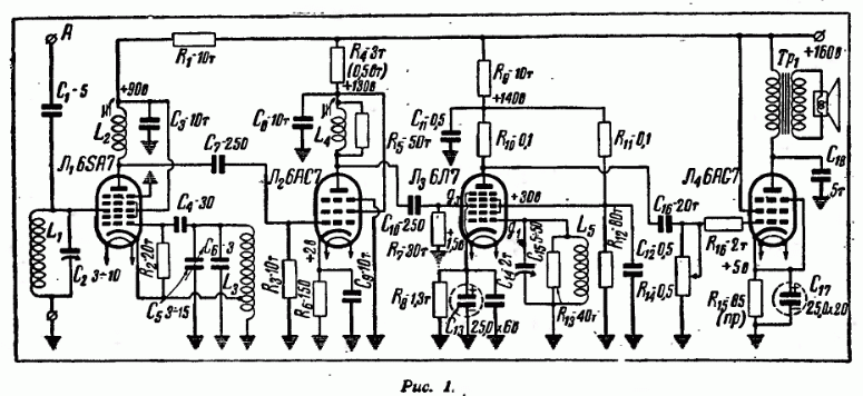Усиленные, колебания промежуточной частоты через конденсатор С10 подаются не как обычно на управляющую сетку g1 лампы Л3, а на ее гетеродинную сетку g3. В цепь управляющей сетки g1 включен контур L5C15, который также настраивается на промежуточную частоту. Обе сетки находятся под небольшим отрицательным напряжением, которое получается за счет падения напряжения на сопротивлении R8. Сопротивление R9 и конденсатор С11 являются развязкой в цепи анода и экранной сетки лампы Л3. На экранную сетку подается небольшое положительное напряжение, снимаемое с делителя R11 и R12, благодаря чему величина этого напряжения остается постоянной вне зависимости от величины анодного тока лампы.