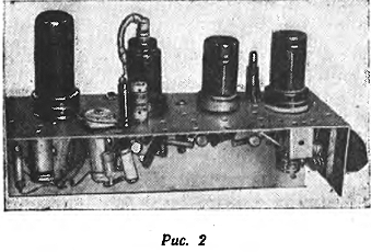 Сверху на шасси располагаются катушки L2, L5, конденсатор С15 и сопротивление R13, причем катушки располагаются по диагонали так, чтобы лампы играли роль экранных перегородок между ними.