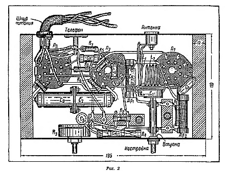 Остальные контурные катушки и конденсаторы располагаются под шасси. На заднюю стенку шасси выводятся гнезда антенны и ось подстроечного конденсатора С5.
