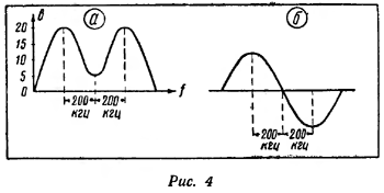 После настройки контуров L1, L4 включается контур L5 и с помощью конденсатора С15 настраивается также на частоту 10,5 МГц. Для этого, вращая подстроечный конденсатор С15, находим такое его положение, при котором выходное напряжение будет наименьшим. При этом в процессе настройки при подходе к резонансу выходное напряжение (громкость звука) сначала будет расти, затем начнет уменьшаться, достигнет определенного минимума и при дальнейшем вращении конденсатора снова будет возрастать (рис. 4, а).