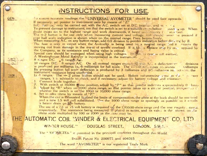 Помимо перечисления Британских патентов № 200977 и 404015, примечательно упоминание о том, что на момент производства прибора была запатентована не только его конструкция "в основных странах мира", но и само слово AVOMETER ("авометр") являлось зарегистрированной торговой маркой фирмы-изготовителя данного прибора. В сочетании с отсутствием номера модели вышесказанное с большой вероятностью позволяет предположить, что описанный измерительный прибор является первым в мире представителем многофункциональных многопредельных измерителей электрических величин - авометров, получивших в дальшейшем широкое распространение.