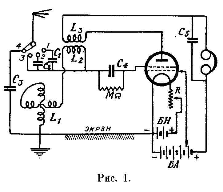 Нижеописанный приемник построен по обычной регенеративной схеме (рис.1). Применение двухсеточной лампы дает возможность дорогостоящую анодную батарею заменить 2-3 батарейками от карманного фонаря. Для тех любителей, которые хотят пользоваться лампой "микро", никаких переделок и изменений делать не нужно; вывод для катодной сетки остается не присоединенным, анодная батарея берется в 40-80 В. Отсутствие в приемнике переменного конденсатора и наличие в нем вариометра значительно удешевляют стоимость приемника.