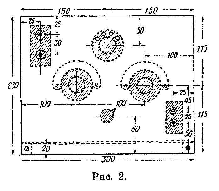 Для соблюдения хорошей изоляции переключатель, клеммы и гнезда монтированы на граммофонных пластинках. Рис. 2 показывает разметку передней панели приемника. Когда панель сделана, ее протирают шкуркой № 2, потом № 1 и, наконец, № 0. После отделки шкуркой панель покрывается морилкой, по просыхании которой лакируется или полируется. Когда отделка окончена, в передней стенке лобзиком пли острым ножом проделывают отверстия для переключателя, гнезд и клемм, а также просверливают отверстие для осей вариометров и реостата. С внутренней стороны передней панели прикрепляется экран, который делается из цинка или меди толщиной приблизительно 0,5 мм или станиоля. В экране также необходимо сделать отверстия для осей вариометра. Крепление вариометров видно из рис. 3 и 4.