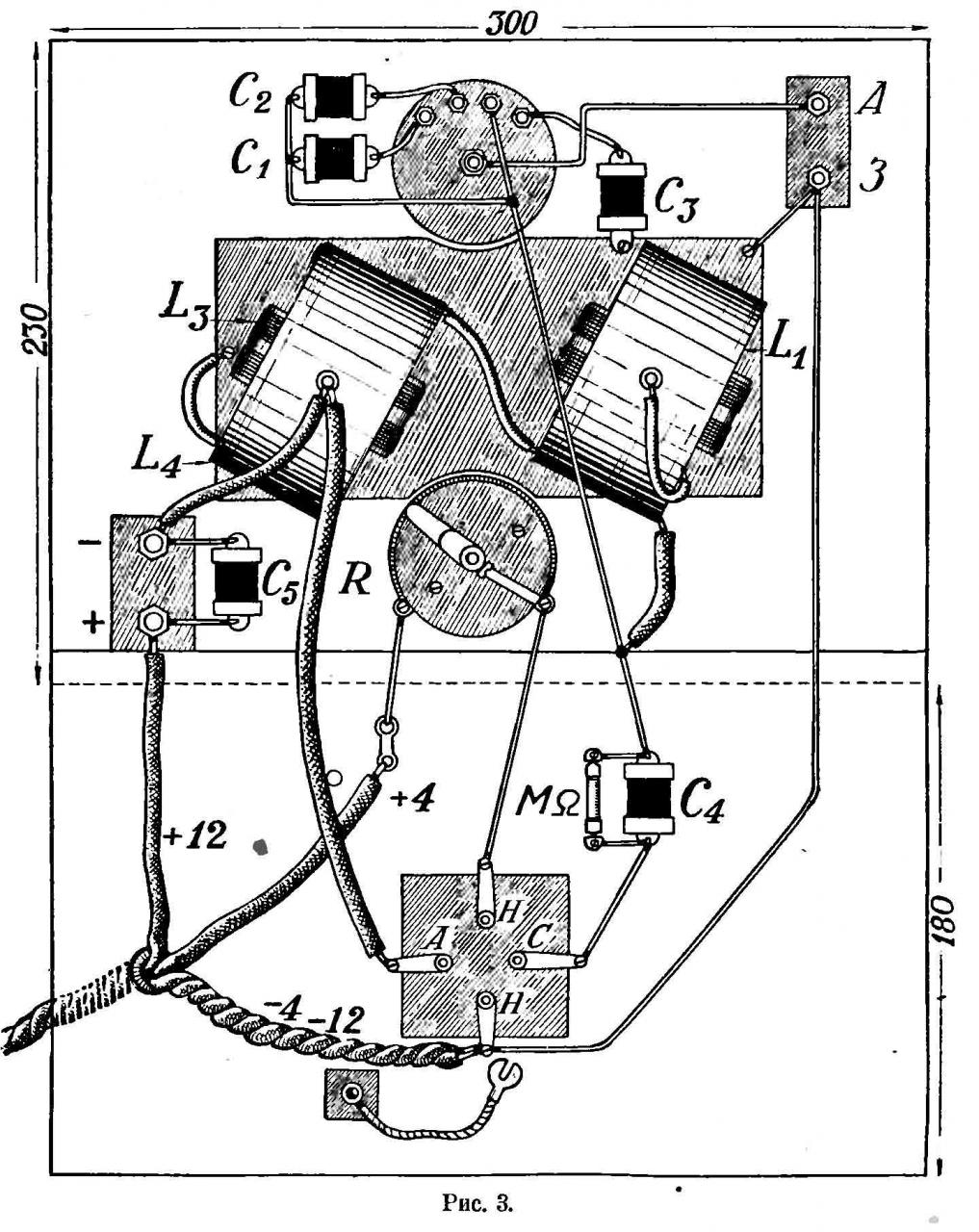 Приемник собран на угловой панели. Размер вертикальной стенки 300х230, горизонтальной 300x180 мм. Горизонтальная стенка приподнята на брусочках, поперечное сечение которых 20x20 мм. На передней стенке монтируются вариометры, переключатель, реостат, гнезда телефона, клеммы антенны и земли. На горизонтальной - ламповая панелька, зажим катодной сетки, через нее также выходят и провода питания. Вся панель сделана из 4-мм фанеры.