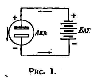 При соединении пластин аккумулятора с каким-либо генератором постоянного (но не переменного) тока, например с батареей (см. рис. 1), протекающий от батареи через аккумулятор электрический ток будет разлагать его раствор, и из него будут выделяться два. газа: кислород и водород, причем кислород будет выделяться на свинцовой пластине, соединенной с положительным полюсом батареи, окисляя поверхность этой пластины, водород же - на пластине, соединенной с отрицательным полюсом батареи и частью будет поглощаться этой пластиной, частью же улетучиваться наружу; если же эта пластина покрыта окисью, то будет раскислять последнюю.