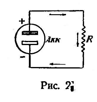 Если по получении окиси, т.е. после зарядки аккумулятора, соединить его пластины помощью проводника между собою, то по этому проводнику потечет уже самостоятельный ток, но направление этого тока будет уже обратное, нежели имел зарядный ток, как то видно из рис. 2, почему та пластина аккумулятора, которая была при зарядке соединена с положительным полюсом генератора, в будет составлять положительный полюс аккумулятора.