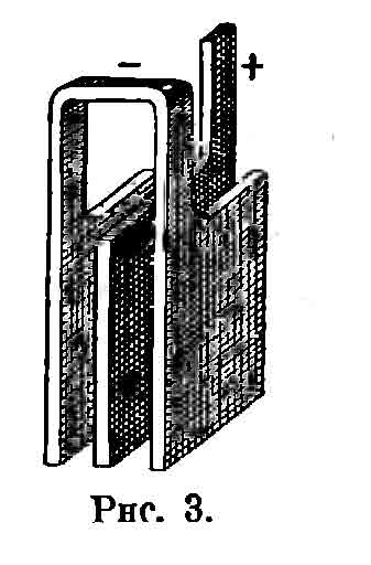 Следует иметь в виду, что задняя сторона положительной пластины аккумулятора принимает участие в работе в значительно меньшей мере, нежели передняя, обращенная к отрицательной пластине и, следовательно, при заряде перекись на ней образуется в значительно меньшем количестве, почему на практике и принято положительную пластинку помещать уже между двумя отрицательными, соединенными вместе, как то и видно из рис. 3.