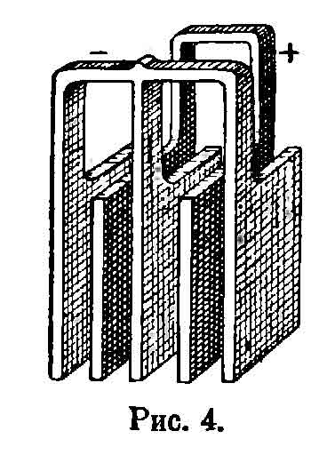 При аккумуляторах больших емкостей, для экономии места, а следовательно и для возможного уменьшения наружных сосудов, обычно применяют уже по нескольку положительных пластин, соединенных вместе, и их размещают между отрицательными, число которых всегда желательно брать на одну более (см. рис. 4).