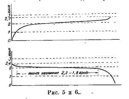 При разряде первоначальное напряжение составляет около 2,4 - 2,3 вольт, но оно весьма быстро падает до 2,2 - 2,15 вольт, дальнейшее же падение совершается весьма медленно в течение всего времени разряда и постепенно доходит до 1,8 - 1,75 вольт, но при самом конце разряда делает скачок, в несколько минут доходя почти до нуля.