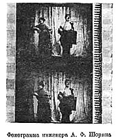 Наши советские системы Шорина (Ленинград, Трест заводов слабого тока) и Тагера (группа - Тагер, Джигит и Шишов, Москва, ВЭИ) отличны друг от друга. Первый применяет метод "осциллографической" записи, с той лишь разницей, что вместо зеркальца у него имеется колеблющаяся металлическая ленточка, которая при колебаниях то открывает, то закрывает пучок света, направленный па пленку. У Тагера же в качестве "модулятора" применен конденсатор Керра1, дающий запись на 2 мм полоске с внутренней стороны перфорации ленты.