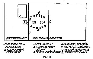 Схематически план съемки показан на рис. 3 и фотографиях. В аппаратной, где расположены усилители, находится съемочный аппарат ("Тагефон"), объектив которого обращен к стеклу в стене, разделяющей аппаратную от большой студии, в которой стоит, микрофон. Ток от микрофона через усилитель подается в аппарат. Съемка, таким образом, производится одновременно на двух лентах: на одной ведется обычная киносъемка ("натура"), а на другой - запись звука2.