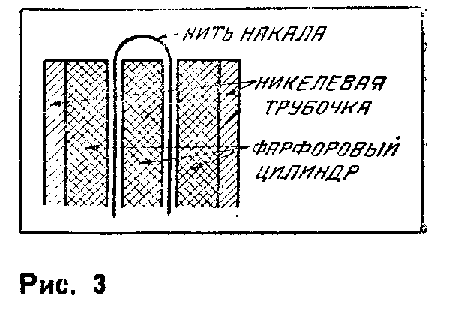 В так называемых "подогревных" лампах катодом является активный оксидный слой, нанесенный на никелевую трубочку. Внутри этой никелевой трубочки помещен фарфоровый цилиндр, имеющий два продольных канала, через которые протянута вольфрамовая нить накала (подогревная нить). Ток, проходящий по этой нити, нагревает фарфоровый цилиндр и никелевую трубочку до температуры темно-красного каления. Схематически устройство "подогревного" катода или, как его еще иначе называют, "катода с косвенным накалом", показано на рис. 3.