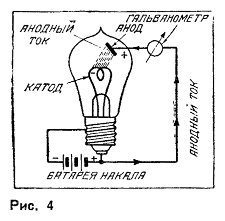 Признаки существования пространственного заряда были замечены еще Эдисоном. Эдисон, производя один из своих многочисленных опытов с лампой накаливания, ввел внутрь баллона лампы, из которого был выкачан воздух, металлическую пластинку (анод). Соединив анод с положительным полюсом батареи, накаливающей нить (катод) лампы, Эдисон заметил, что по проводнику, соединяющему анод с катодом, течет электрический ток (рис. 4). При соединении же анода с отрицательным полюсом батареи тока в соединительном проводнике не обнаруживалось. Это явление было названо эффектом Эдисона, хотя сам Эдисон так и не смог объяснить, каким образом электрический ток может проходить через "пустоту" внутри электрической лампы от анода к катоду.
