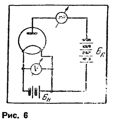 На рис. 6 приведено схематическое (упрощенное) изображение двухэлектродной лампы с присоединенными батареями и измерительными приборами в цепях накала и анода.