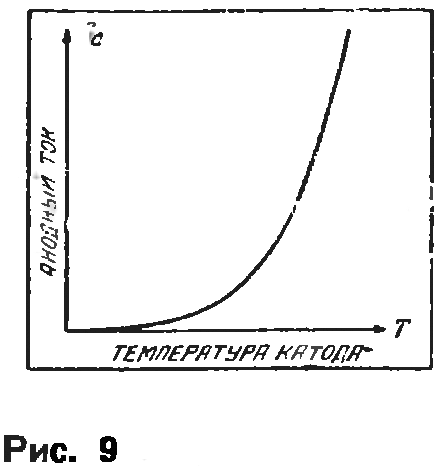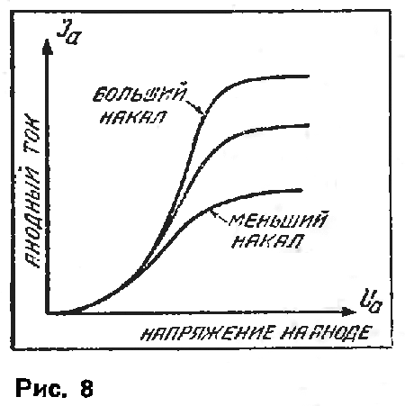 На рис. 7 приведена кривая зависимости анодного тока двухэлектродной лампы от анодного напряжения при постоянном напряжении батареи накала. Такая кривая, построенная на основании измерений различных значений анодного напряжения и соответствующих им значений анодного тока, при неизменном напряжении на нити накала, называется характеристики данной лампы. Характеристики одной и той же лампы, снятые при разных значениях напряжения накала, будут отличаться в верхней своей части друг от друга (рис. 8). 0бъсняется это тем, что чем выше напряжение батареи накала, тем большей силы ток будет протекать через нить данной лампы, и, следовательно, тем выше будет температура нагрева катода. А с увеличением температуры катода быстро растет число электронов, излучаемых катодом (рис. 9). Следовательно, чем выше будет напряжение накала, тем больше будет ток насыщения, т.е. тем выше будет подниматься характеристика лампы (рис. 8).