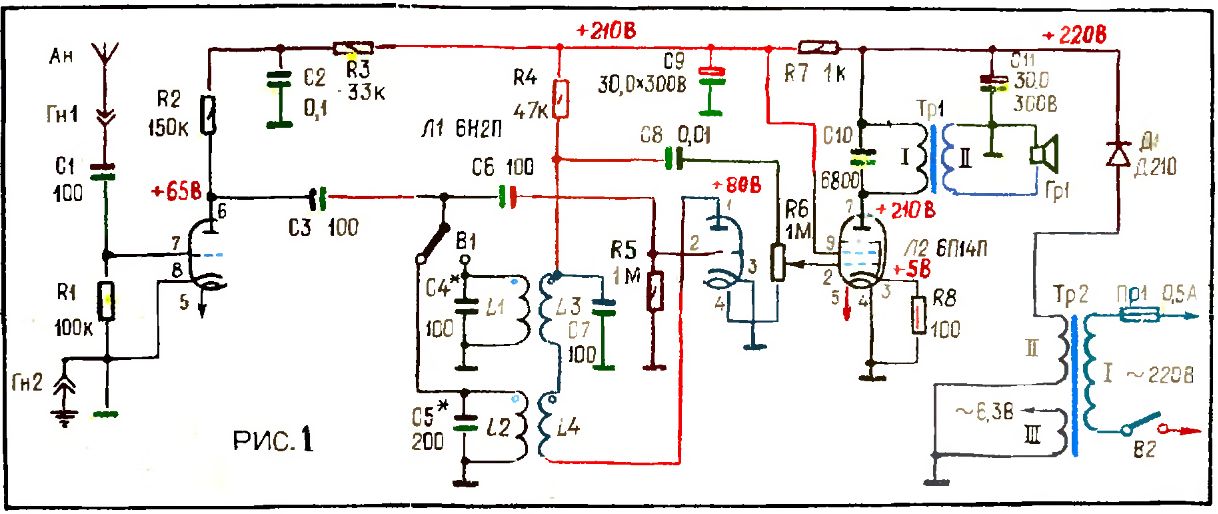 Принятые антенной Ан сигналы проходят через конденсатор связи С1 и выделяются на резисторе R1. Отсюда напряжение высокой частоты поступает на сетку лампы Л1. Усиленные левым триодом сигналы с анодной нагрузки - резистора R2 - через конденсатор С3 и переключатель В1 попадают в один из приемных контуров L1C4 или L2C5. Если контур настроен в резонанс с частотой принимаемой радиостанции, то ток высокой частоты в контуре, а следовательно, и напряжение на нем достигают максимальной величины.