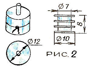 Как и в любом радиоприемнике, основная деталь здесь - катушки индуктивности. В данной схеме могут работать контурные катушки различных конструкций. Лучший вариант - катушки, заключенные в карбонильные горшкообразные сердечники типа СБ-la (рис 2). Такой сердечник представляет собой закрытую чашечку цилиндрической формы, составленную из двух разъемных половин. Внутри сердечника на каркасе из изоляционного материала размещается обмотка из провода марки ПЭЛ или ПЭВ диаметром от 0,1 до 0,25 мм. Если радиостанция находится в диапазоне средних волн, достаточно намотать 100-120 витков, а для диапазона длинных волн 300-350 витков. Предпочтение следует отдать проводу с большим диаметром, если он, конечно, сможет разместиться на каркасе.