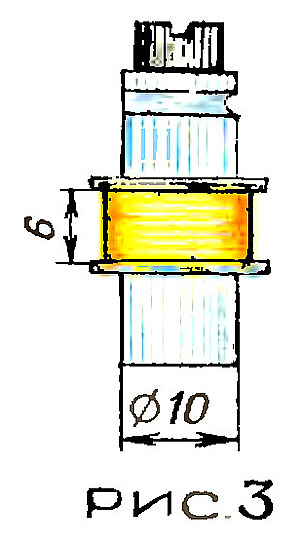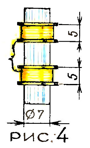 В случае отсутствия горшкообразного или обычного стержневого сердечника вам придется изготовить двухсекционную катушку, размеры которой приведены на рисунке 4. Она состоит из двух отдельных секций, соединенных между собой последовательно. Индуктивность такой катушки зависит не только от общего количества витков (280 витков для диапазона СВ и 550 - 600 витков для диапазона ДВ), но и от расстояния между секциями. Чем ближе расположены между собой секции катушки, тем больше индуктивность. В каждой секции катушки разместите половину общего числа витков. Обе секции намотайте в одну сторону. Каркас катушки склейте из бумаги или тонкого картона.
