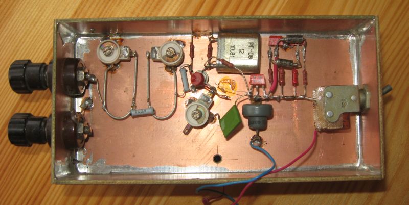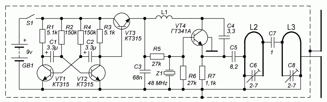 Для получения сигнала с АМ в цепь питания включен НЧ-мультивибратор на частоту 800-1000 Гц.