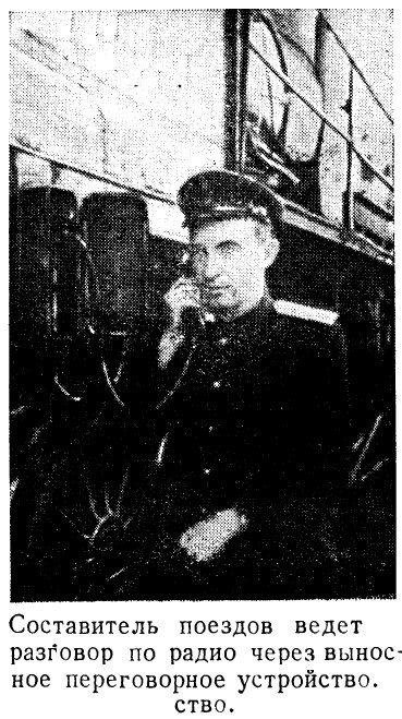 Пользуясь паровозной радиостанцией, с диспетчером или дежурным могут связываться также составитель или сцепщик. Для этого им не нужно подниматься в будку машиниста. С правой стороны снаружи паровоза у входной лестницы устанавливается выносное переговорное устройство, представляющее собой герметически закрывающуюся коробку с микротелефонной трубкой. Пользуясь ею, составитель с земли ведет разговор по радио, переключая радиостанцию с приема на передачу так же, как это делает машинист паровоза со своего рабочего места.