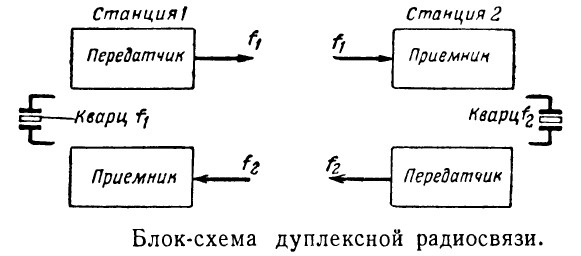 Второй способ, использующий две частоты, является дуплексным. Передача в одном направлении происходит на одной частоте, а в обратном направлении на другой. Для того чтобы разделить каналы, вход передатчика и вход приемника обеих радиостанций снабжаются заграждающими фильтрами.