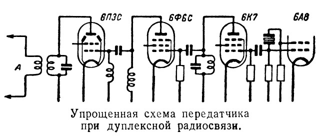 В приемнике связь приемной антенны с сеточным контуром первой лампы осуществляется через двухконтурный полосовой фильтр. Такое устройство необходимо для обеспечения высокой избирательности, требующейся при одновременной работе приемника и передатчика в дуплексном режиме.