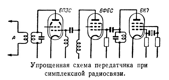 При симплексной работе оказывается необходимым переключать радиостанцию с приема на передачу и обратно. Такое переключение производится с помощью реле, снимающего при переходе на передачу анодное питание с ламп приемника и подающего его на аноды ламп передатчика.
