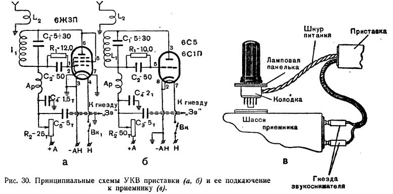 Приставка представляет собой одноламповый сверхрегенеративный детектор и имеет диапазон от 36 до 75 мегагерц (мггц). Она питается от выпрямителя приемника через специальную колодку (рис. 30, е). Колодка представляет собой цоколь от восьмиштырьковой лампы с надетой на него панелькой. Питание удобнее всего брать от последней лампы (6Ф6, 6П6 и т. д.). Эта лампа вынимается из приемника, в ее панельку вставляется колодка питания приставки, а лампа вставляется в ламповую панель колодки.