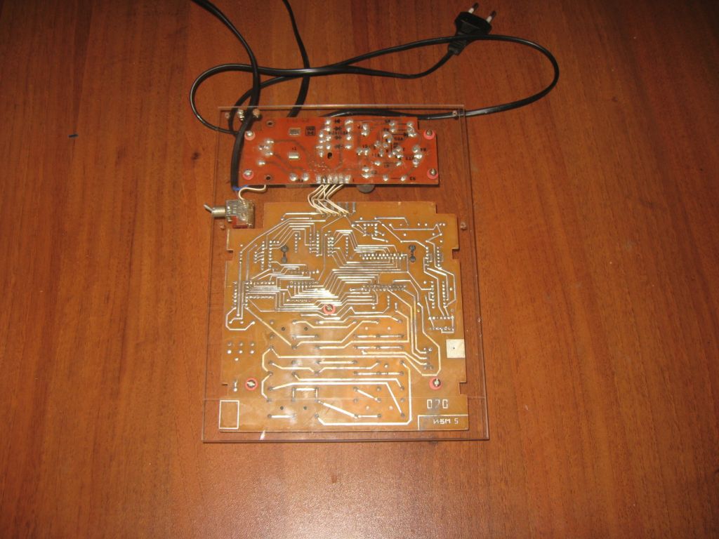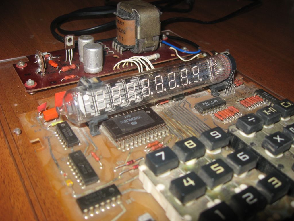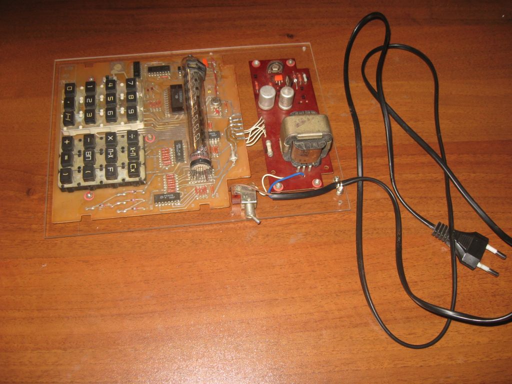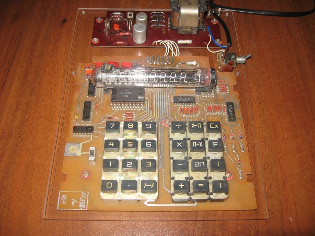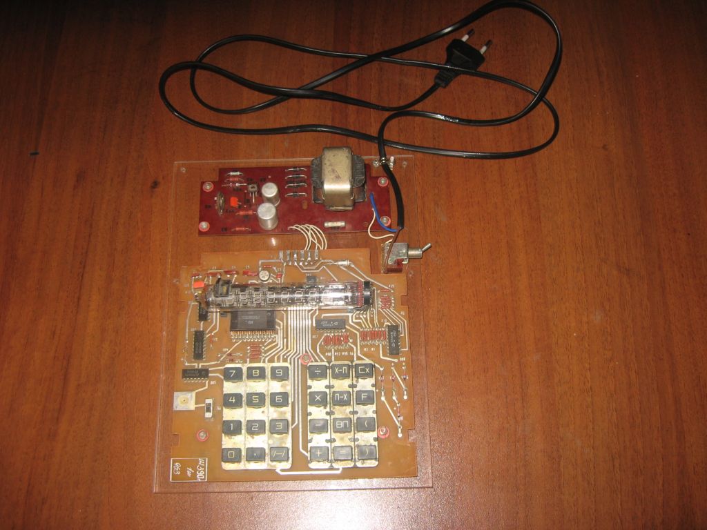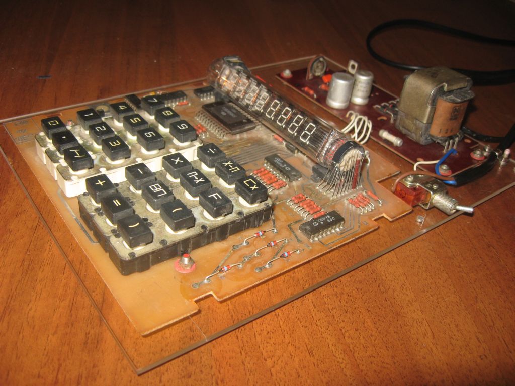 Это конструкция выходного дня. Была в наличии начинка от старого калькулятора, предположительно "Электроника МКШ-2М", после небольшого "шаманизма" она заработала, но вот што с ней делать дальше - непонятно, так как найти корпус для этого калькулятора или "донора" задача довольно сложная. Так она и лежала бы еще неизвестно сколько времени, но мне в качестве наглядного пособия нужно было что-нибудь похожее на калькулятор, чтобы можно было наглядно показать его устройство. Ну вот и возникла идея сделать такой стенд. Собственно отремонтированная электроника просто разместилась на куске оргстекла (предполагается что еще сверху будет крышка из оргстекла, защищающая от случайного прикасновения к высоковольтным цепям. Все, стенд можно использовать, но в случае если вдруг случайно найдется корпус от этого калькулятора - его легко разобрать и использовать начинку по прямому назначению (никаких механических изменения в плату не вносилось, закрепление на основании из оргстекла только через имеющиеся на платах отверстия). Вот так калькулятор обрел вторую жизнь :)