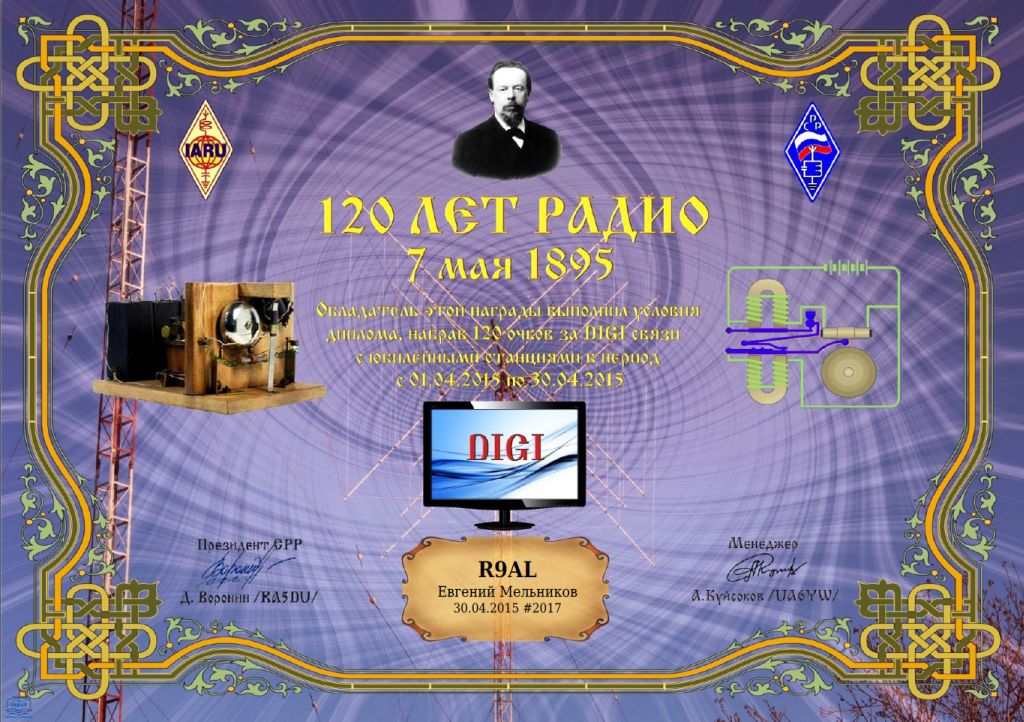 Выдаётся за радиосвязи со ВСЕМИ российскими юбилейными станциями R1895R, R2015R, R120RA-R120RZ (всего 28). Либо нужно набрать 300 очков по Положению диплома «120 лет Радио».