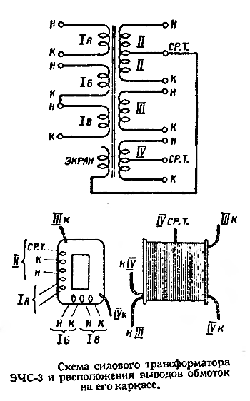 58 - выходной трансформатор; II обмотка имеет две секции для включения как высокоомных, так и низкоомных громкоговорителей.