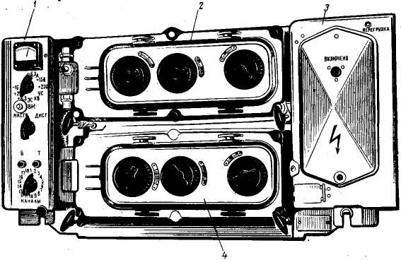 Электроизмерительный прибор является индикатором настройки, а также вместе с галетным переключателем обеспечивает проверку исправности отдельных электрических цепей передатчика (путем проверки напряжений и токов в этих цепях). Во время настройки передатчика показания прибора устанавливаются по таблицам настройки, а его показания в соответствии с положениями переключателя даны в «Инструкции по настройке» для каждого передатчика индивидуально. Переключатель «Каналы» на 18 положений служит для переключения каналов настройки при работе передатчика в режиме настройки.