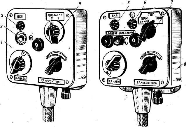 1— пульт летчика; 2 —гнездо для включения микрофона; 3, 5 — лампочки сигнализации включения пультов; 4 — переключатель управления пультов; 6 — лампочка сигнализации включения барореле;. 7 — переключатель режимов; 8 — пульт радиста