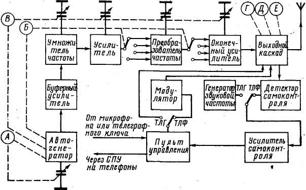 Режимы работы преобразователя частоты переключаются с помощью ручки «Б» (этой же ручкой переключаются частотные поддиапазоны оконечного усилителя, соответствующие режимам работы преобразователя). Для плавной перестройки по частоте всех каскадов возбудителя, кроме автогенератора и буферного усилителя, служит ручка «В». Выходной каскад обеспечивает усиление мощности высокочастотных колебаний до величины, необходимой для питания антенны передатчика.