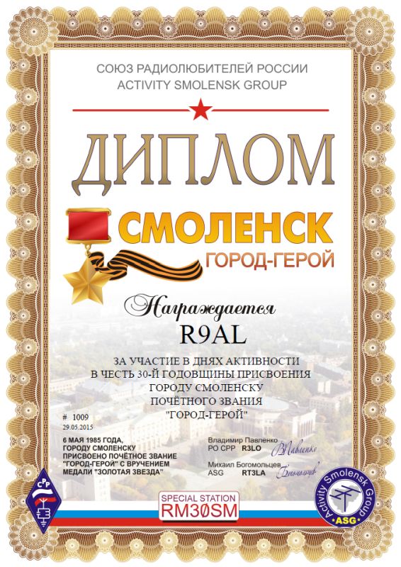 С 1 мая по 12 июня 2015 года в радиолюбительском эфире проводится радиомарафон "СМОЛЕНСК ГОРОД-ГЕРОЙ".