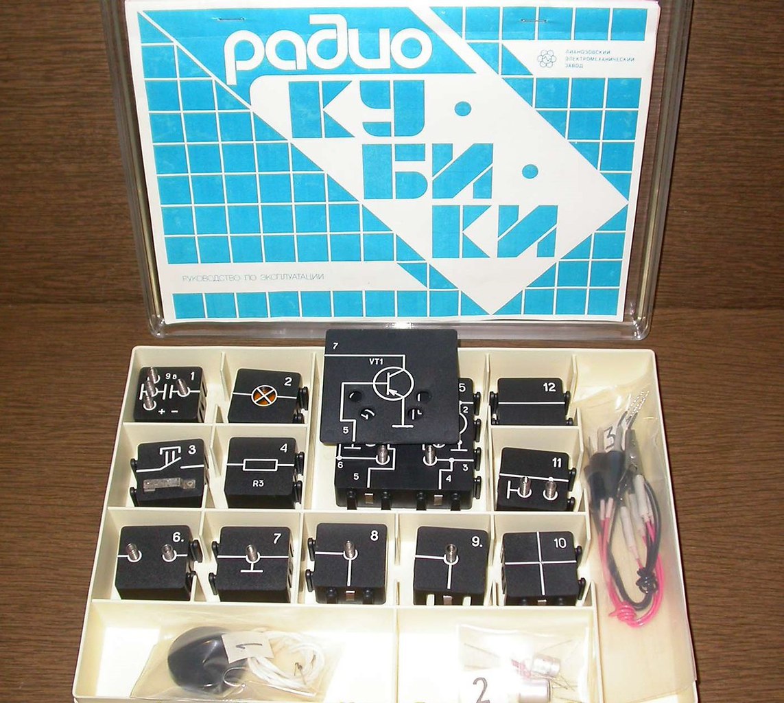 Набор "Радиокубики" (учебный) выпускался с 1988 года Лианозовским электромеханическим заводом. Набор "Радиокубики" (учебный) предназначен для технического творчества учащихся общеобразовательных школ, членов технических кружков, начинающих любителей электроники. Подобных наборов, часто с одинаковым наименованием "Радиокубики" (иногда с добавлением буквы) в 80-е годы различными заводами выпускалось несколько вариантов.