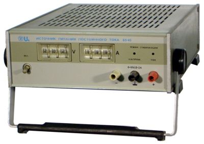 Источник постоянного тока общего применения Б5-45 предназначен для питания радиотехнических устройств стабилизированным напряжением и током в лабораторных и цеховых условиях. Наличие дистанционного управления позволяет использовать их в АИС. Величина выходного напряжения и тока может регулироваться вручную и дистанционно электрическими сигналами в коде 8-4-2-1. В зависимости от положения органов управления и от величины нагрузки источники питания могут работать в режимах стабилизации напряжения или тока. Переход от одного режима к другому происходит автоматически при превышении нагрузки (тока или напряжения) установленного значения, обеспечивая тем самым защиту источника питания и потребителя от перегрузки. Напряжение устанавливается в диапазоне от 0,1 до 49.9 В, и ток от 0,0001 до 0,499 А (Дискретность установки напряжения - 0,1В, тока - 1 мА).