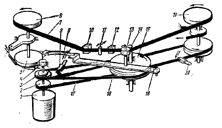 1 - электродвигатель; 2 - шкив для привода приемного узла; 3 - двухступенчатый шкив для привода ведущего узла; 4 - насадка электродвигателя; 5 - диск подающего узла; 6 - подающий узел; 7 - магнитная лента; 8 - перекидная вилка переключателя скорости; 9 -плоская пружина; 10 - стирающая головка; 11 - направляющая колонка; 12 - универсальная головка; 13 - прижимной обрезиненный ролик; 14 - ведущий вал; 15 - маховик ведущего вала; 16 - пассик ведущего узла; 17 - пассик приемного узла; 18 - рычаг прижимного обрезиненного ролика; 19 - приемный узел; 20 - перекидная вилка