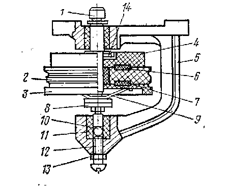 1 - ось; 2 - ведущий шкив; 3 - ведомый диск; 4 - тормозной диск; 5 - кронштейн; 6, 7 - фетровые шайбы; 8 - гайка специальная; 9 - плоская пружина; 10 - опорный шарик; 11 - нижний подшипник; 12 - регулировочный винт; 13 - контргайка; 14 - штифт тормозного диска