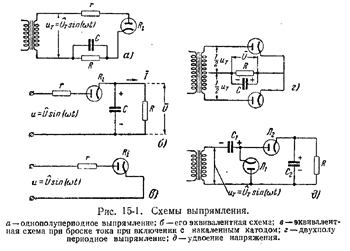 Наиболее тяжелый режим работы кенотрона имеет место при работе выпрямителя на нагрузку через фильтр с емкостным входом (рис. 16-1,а). В простейшем случае (рис. 1'5-1,б) такой фильтр состоит из одного конденсатора достаточно .большой емкости, необходимой для требуемого сглаживания пульсации. Наиболее опасным моментом работы кенотрона является момент включения выпрямляемого напряжения при накаленном катоде. В этот момент наблюдается бросок тока, идущего на зарядку конденсатора фильтра С. В случае отсутствия специально включаемого для ограничения этого тока сопротивления R и при достаточно большой емкости конденсатора С (20 - 40 мкФ) диод практически оказывается включенным на .полное напряжение вторичной обмотки трансформатора. Эквивалентная схема выпрямителя в момент броска тока через конденсатор изображена на риг. 15-1,в. Так как подобный бросок тока может быть опасным для работы катода и приводит во многих случаях к местным перегревам катода и к пробою кенотрона с неизбежным разрушением оксидного слоя на катоде, то для ограничения этого тока необходимо включать защитное сопротивление R. Величина этого сопротивления включает и сопротивление обмотки трансформатора, учитывая пересчитатанное на вторичную обмотку значение сопротивления первичной обмотки.