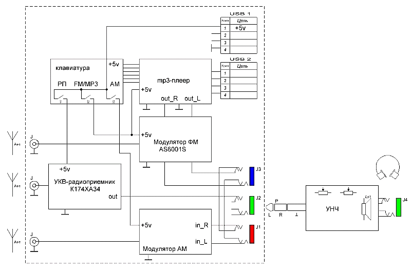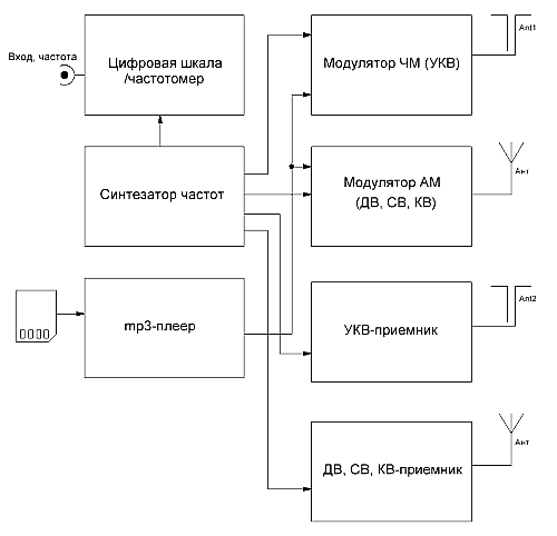 Ну и как это все можно реализовать. Вариантов два, либо разработать все "с нуля", либо использовать в качестве основы какую-либо автомобильную радиолу. использование готовой авторадиолы мне кажется более предпочтительным, во-первых, там уже есть синтезатор, мп3-плеер, и радиоприемники. Цена недорогой радиолы сегодня - на порядок дешевле, чем покупать детали для самоделки. Плюсом то, что радиола уже имеет какой-никакой корпус, и в современных недорогих авторадиолах он практически пустой. В итоге, в авторадиолу достаточно добавить два модулятора - ФМ и АМ, соответвующим образом переделав схему, так чтобы для модуляторов использовать уже имеющийся в радиоле синтезатор.