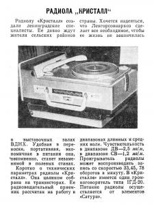 Технических параметрах радиолы ''Кристалл'': Радиола целиком собрана на транзисторах. Приёмник модели рассчитан на работу в диапазонах длинных и средних волн. Чувствительность в диапазоне ДВ 2,5, СВ 1,2 мВ/м. Избирательность по соседнему каналу около - 20 дБ. Диапазон эффективно воспроизводимых звуковых частот при проигрывании грампластинок 200...7000 Гц. Номинальная выходная мощность усилителя радиолы около 150 мВт. Проигрыватель радиолы может воспроизводить грамзапись со скоростью 33, 45 и 78 об/мин. В радиоле применён громкоговоритель 1ГД-20. Питается радиола от шести элементов 373 ''Сатурн''. Всего заводом было выпущено около 3-х тысяч радиол.