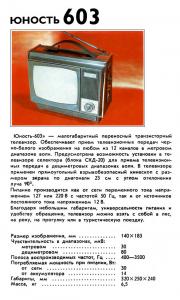 Телевизор ''Юность-2'' в 1973 году был модернизирован в ''Юность-602'' (УПТ-23-VI). В 1974 года телевизор был переименован в ''Юность-603'' (ПТ23-VI-3). Затем в 1975 году в телевизор ''Юность Р-603''. Параметры и внешнее оформление всех трёх моделей практически одинаковы. Что обозначает буква ''Р'' выяснить не удалось. Пластмассовый футляр телевизора ''Юность-603'' (Р-603) с отделкой боковин из искусственной кожи (в небольшой серии). Выпускался телевизор с различными вариантами оформления. Работает он в диапазоне МВ а при установке блока СКД-20 и в ДМВ диапазоне. Справа расположены; ручка настройки ДМВ, ручка включения, совмещённая с регулятором яркости, кнопки переключения МВ-ДМВ диапазонов и антенн, гнёзда внешних антенн. Сзади расположен разъём питания 220/12 В. На передней панели находится ручка ПТК и гетеродина. Другие ручки на ходятся наверху и сзади. В схеме модели имеется ряд автоматических регулировок. Возможно прослушивание звука на головные телефоны. Чувствительность модели 30 мкВ, разрешающая способность - 350 линий. Выходная номинальная мощность - 0,3 Вт. В АС используется динамик 0,5ГД-30, вместо 0,5ГД-17 (модели 2/602). Размеры телевизора 320х250х240 мм. Вес 6,5 кг. Цена - 257/260 рублей.