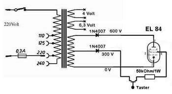 Если надо регенерировать пентод, например, EL84, то используют вторую кнопку подающую 300 В, которые выпрямляются также диодом 1N4007, и с нагрузочным сопротивлением 50 кОм мощностью 1 Вт на вторую сетку EL84 - смотри следующую картинку: